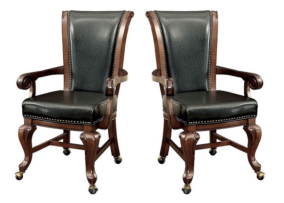 " Our Akron Brown Cherry Poker Chairs will add a vintage classic feel to your game room or dining room. These poker chairs features a 360 degree swivel. The black leatherette combined with the nail head trim, carved arms and legs on casters adds to the vintage feel of the chair. It is made from...